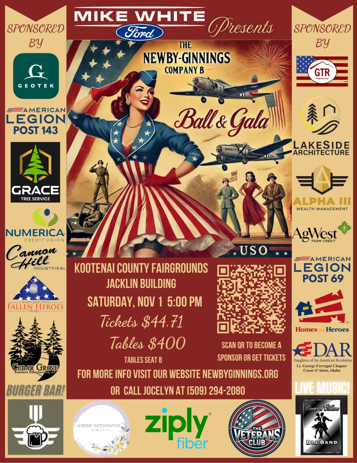 Join us for the biggest event of the year! This fundraiser is for the Newby-ginnings Veteran Community Center. It will be held at the Kootenai County Fairgrounds in the Jacklin Building. Saturday, November 1st, 2025, will be an evening to remember! Put on your best 1940’s USO dance shoes and attire, and help our effort to better the lives of our local Veterans, Active duty, and Gold Star Families!